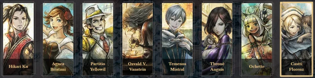 Castti Florenz: อาชีพ Apothecary นักปรุงยาความจำเสื่อม อีกหนึ่งตัวละครสาย Support ของทีม มีสกิลปรุงยาช่วยเหลือทีมได้ดีมาก หากเลือกอาชีพเสริมเป็น Cleric ทำให้ช่วงต้นเกมและกลางเกม เธอเป็นตัวเลือกที่ดีที่สุดในการนำมาช่วยเหลือทีมได้เลย ความสามารถส่วนตัวก็คือ Concoct จะใช้ไอเทมนำมาปรุงยา ในช่วงท้ายเกมเมื่อไอเทมพร้อมแล้วสกิลนี้ช่วยเหลือทีมได้ดีเป็นพิเศษ โดยเฉพาะการเติม BP ให้เต็มทั้งทีม