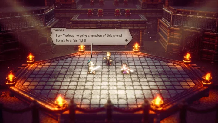 ในสนามประลองเราจะได้เจอกับ ยูรินาส แชมป์เก่าของสนามประลองแห่งนี้ สำหรับยูรินาสนั้นจะค่อนข้างเก่งอยู่บ้าง หากใครที่เลเวลยังไม่สูงจะไม่สามารถเอาชนะเธอได้ หากต้องการชนะก็ควรจะมีเลเวลประมาณ 40 ขึ้นไป ในการต่อสู้นี้เราไม่จำเป็นต้องเอาชนะเธอก็ได้เควสก็จะเสร็จอยู่ดี แต่หากชนะเธอได้เราจะได้รับเครื่องประดับที่ชื่อว่า Champion’s Belt เมื่อใส่จะเพิ่มพลังโจมตีกายภาพ 100 และคริติคอลอีก 100 นับว่าเป็นเครื่องประดับที่ดีมาก ในกรณีที่เราแพ้เธอหากต้องการได้รับ Champion’s Belt ก็ให้กลับมาที่เคาท์เตอร์แล้วคุยกับเจ้าหน้าที่เพื่อท้าทายเธออีกครั้งก็ยังได้ ทุกครั้งที่เอาชนะเธอได้เราก็ได้รับ Champion’s Belt มา