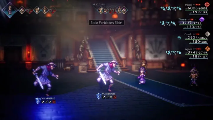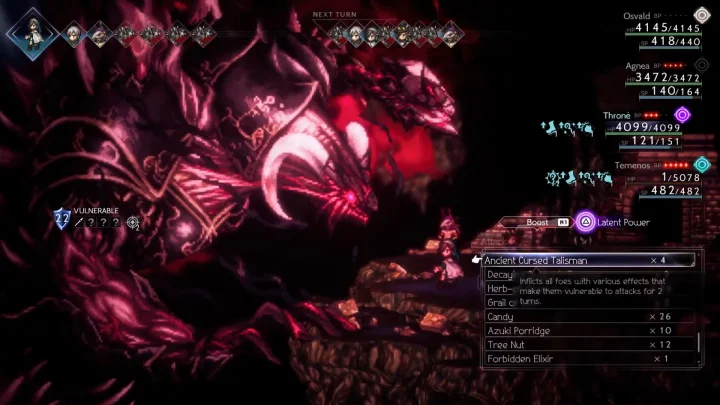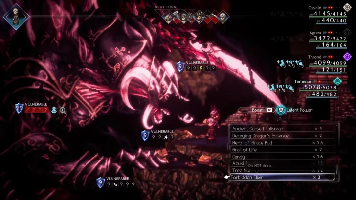 - คนแรก เลือก Item เลือก Forbidden Elixir แล้วกดใช้ที่ เทเมนอส จะทำให้เขาฟื้นฟู SP และ BP เพื่อเตรียมใส่ท่าใหญ่อีกครั้งนั่นเอง
