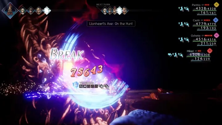 - ฮิคาริ หากฮิคาริได้เทิร์นก่อนคนอื่นก็ให้กด Defend เพื่อทำให้ฮิคาริ ได้เทิร์น อีกครั้งเป็นคนสุดท้ายนี่แหละ เพราะส่วนแขนของ Galdera อยู่ในสภาพ Break แล้ว ก็กด Boost x4 เลือก Armsmaster Skills แล้วเลือก Warlord’s Spear เมื่อใช้สกิลเสร็จแล้วแขนของ Galdera จะต้องปลิวหายไปทั้งหมด หากมันไม่ถูกทำลายแสดงว่า ฮิคาริมีค่าพลังโจมตีกายภาพไม่พอ จะต้องออกไปเก็บเลเวลหรือปรับเปลี่ยนอุปกรณ์เพื่อทำให้ฮิคาริมีพลังโจมตีที่มากพอ
