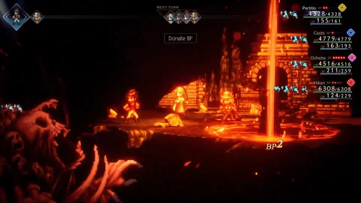 - ฮิคาริ หากได้เทิร์นก่อนคนอื่นก็ให้กด Defend เพราะเราจำเป็นต้องให้ฮิคาริโจมตีเป็นคนสุดท้ายของเทิร์น หลังจาก Galdera Break แคสตี้เติม BP และพาร์เททิโอสาดดีบัฟให้แล้ว ก็กด Boost x4 เลือก Armsmaster Skills แล้วเลือก Warlord’s Spear เมื่อใช้สกิลเสร็จแล้วแขนของ Galdera จะต้องปลิวหายไปทั้งหมด