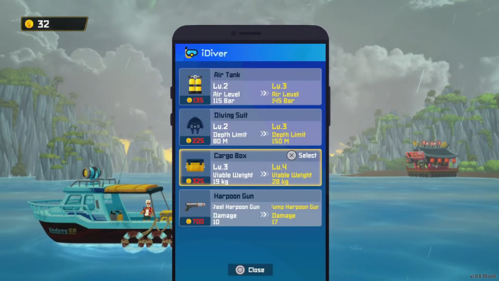ในช่วงเริ่มต้นเกม สิ่งที่ควรให้ความสนใจและเน้นการอัพเกรดก่อนเลยก็คือ Cargo Box เพราะมันจะเพิ่มความจุทำให้ในการดำน้ำแต่ละครั้งเราจะจับปลาได้เพิ่มมากขึ้น ต่อมาก็จะเป็นถังออกซิเจน ส่วนนี้ควรอัพไว้สักเลเวล 3 หรือ 4 ก็พอ แล้วอาศัยเก็บออกซิเจนเพิ่มจากพวกถังออกซิเจนที่เราเจอในน้ำแทน ต่อมาก็จะเป็นฉมวก หากเราสามารถจับปลากลับมาแบบเป็นๆ มีชีวิตอยู่ได้ จะทำให้ได้รับเนื้อที่มีคุณภาพดีขึ้น การอัพฉมวกก็เลยสำคัญเพราะทำให้จับปลาได้สะดวกมากขึ้น ส่วนชุดดำน้ำให้ค่อยๆ อัพไปตามลำดับ หากต้องการทำภารกิจหลักก็ให้อัพเท่าที่จำเป็นต่อเนื้อเรื่องก็พอ สุดท้ายยังไงชุดดำน้ำเราก็ต้องอัพมันจนถึงเลเวลสุดท้ายอยู่ดี