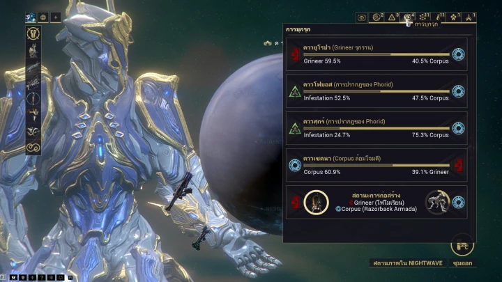 เงื่อนไขนี้จริงๆ แล้วในตอนที่ทำเควส Archwing เสร็จ ในไกด์ของเราก็มีการแนะนำให้ติดตั้งตัวปล่อย Archwing ให้อยู่แล้ว แต่หากใครยังไม่ได้ทำก็ เข้าไปที่ คลังอาวุธ แล้วเลือกไปที่เมนู อุปกรณ์ จากนั้นเลือกไปที่คำว่า อุปกรณ์อีกที แล้วก็ให้กดคลิ๊กที่ช่องว่างในวงล้อ จากนั้นให้หาสิ่งที่มีชื่อว่า ตัวปล่อย Archwing (Archwing Launcher) ให้คลิ๊กที่มัน เพื่อทำการติดตั้งลงไปในวงล้ออุปกรณ์