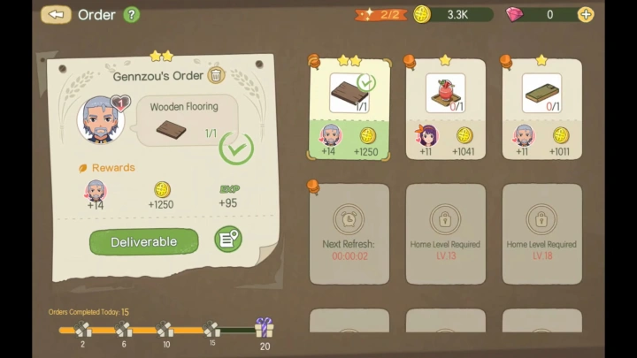 เลเวลของตัวละครเราจะเป็นตัวกำหนดเลเวลสูงสุดของบ้านที่เราสามารถอัพได้ด้วยเช่นกัน ซึ่งการเพิ่มเลเวลให้กับตัวละคร ก็จะมีหลากหลายวิธีเลย ทั้งการสร้างของ, เก็บวัตถุดิบ, ทำอาหาร อะไรพวกนี้ล้วนแล้วแต่เพิ่มเลเวลตัวละครให้ได้ทั้งนั้น แต่ส่วนที่ได้เยอะและแนะนำให้ทำก็คือ การทำเควส และ ส่งของใน Order Board หากอยากเพิ่มเลเวลเร็วๆ แนะนำให้ไล่ทำ Order Board เรื่อยๆ ได้เลย