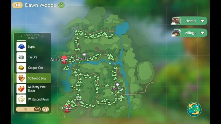 ภายในเกมหากเรากดไปที่บริเวณขวาบนที่เป็นแผนที่เราจะสามารถขยายมันได้ อีกทั้งยังกดวาร์ปไปยังแผนที่ต่างๆ ได้เลย ไม่ต้องเสียเวลาเดินไปมาระหว่างแผนที่ เป็นการประหยัดเวลาเอามากๆ อีกทั้งหากเรากดแผนที่ใหญ่ในบริเวณที่เป็นเขตหาวัตถุดับอย่างเช่นใน Dawnwood มันจะปรากฏรายการวัตถุดิบต่างๆ ขึ้นมา ทีนี้หากเราแตะไปที่ชื่อของวัตถุดิบ ก็จะแสดงให้เราเห็นด้วยว่าจะหาวัตถุดิบนั้นๆ ได้จากบริเวณไหนบ้าง นับว่าเป็นระบบที่สะดวกมากเลยทีเดียว